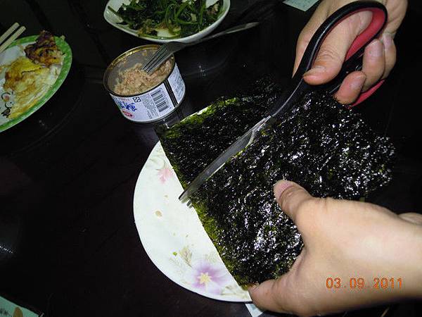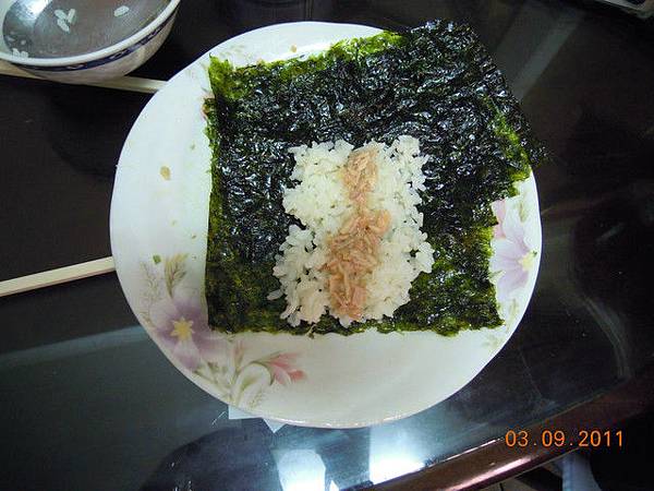 這幾天我都刻意多煮一些飯,剩飯拿來做飯捲給孩子當宵夜,我把海苔剪成4等份比較好捲,直接用手就可以捲了,一捲一口!!
