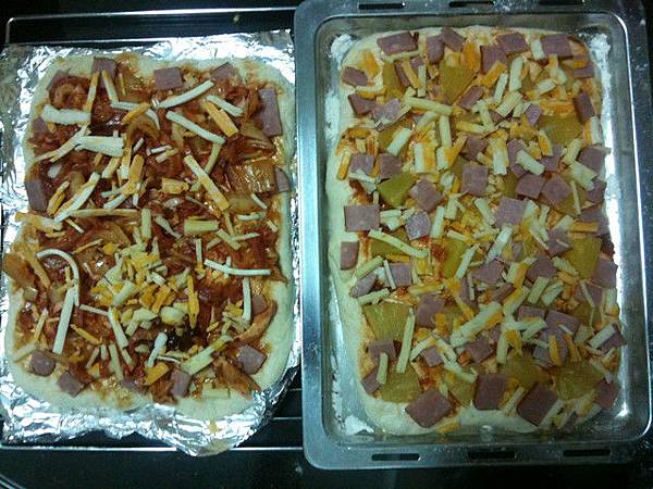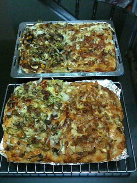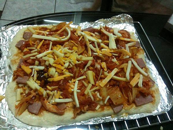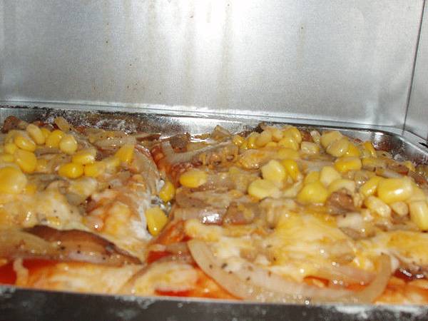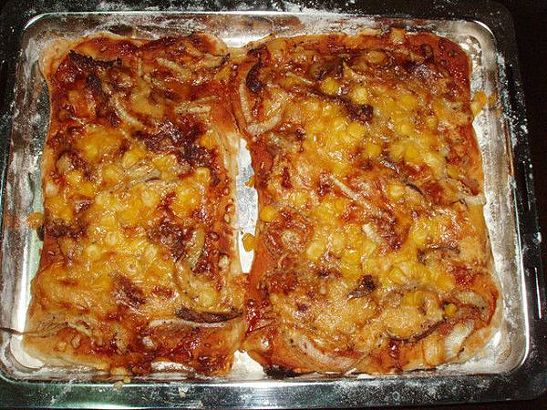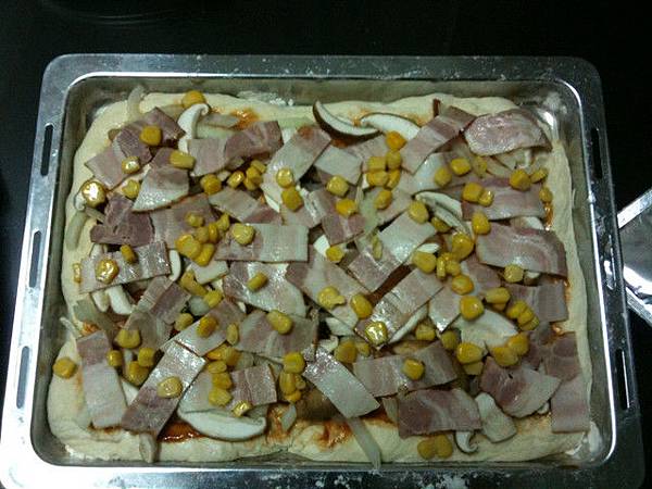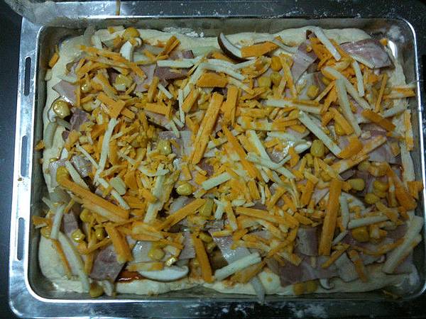 鋪上黑胡椒豬肉餡料(洋蔥、鮮香菇、豬肉先拌炒比較香),再加玉米粒和起司絲,剛好沒甜椒和青椒,不然色澤更讚