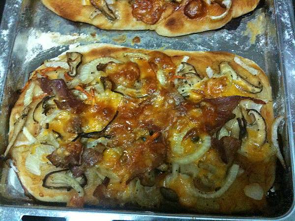 成功的做了五分鐘歐式麵包後,我發現沒加蓋的麵包比較酥脆,孩子非常愛吃,這引發了我拿來做披薩餅皮的構想,一google才發現,真的也有不少網友是這樣做的。