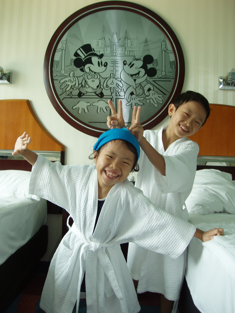 到達迪士尼樂園的好萊塢飯店已經很晚了,這間飯店平日就要台幣4千多元,還可以住兩晚,也可以玩二日樂園,雖然不含早餐,但還是很值得。床型是2中床,睡4個大人也OK。