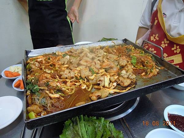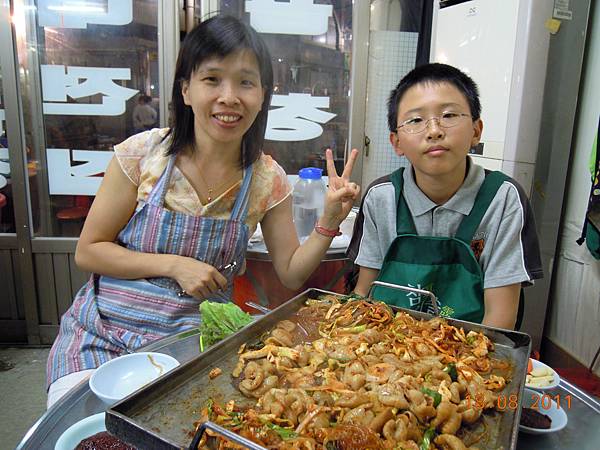 1次至少點2人份(16000W),就這麼大一盤,約台幣438元,這大概是我唯一覺得比台灣便宜的一餐。我拿韓文秘笈「請不要太辣」給阿珠媽看,可是還是辣得不得了!因為韓文秘笈沒有「白飯」這兩個字,我們想加點白飯,又怕阿珠媽給我們做炒飯,比手話腳了半天,直接比電子鍋比較快。第1次沒有導遊帶來到一個語言完全不通的國家,忽然間覺得自己好像是一個又「聾」又「啞」的文盲。