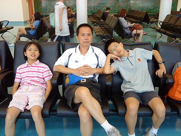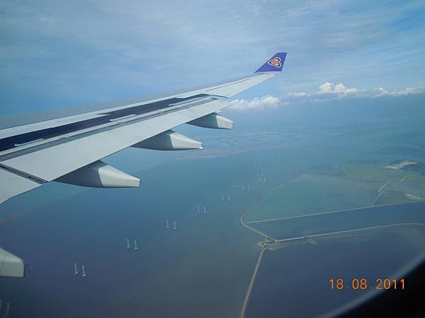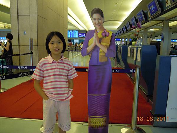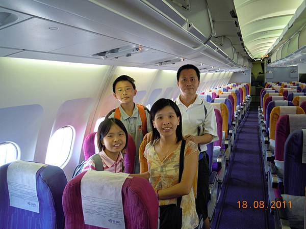 第一是飛機的座椅顏色非常繽紛,看照片別以為這班飛機座位很空,其實飛機是完全客滿的,我們是第2組上飛機的乘客,空姐看我們在拍照便熱心主動幫我們拍全家福。第二是一定要用英語跟空姐空少溝通,很有出國的fu,泰航還有空少,不像華航清一色都是空姐。