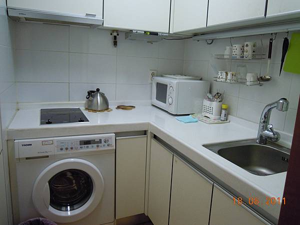 房間裡真的如老闆所說「什麼都有」。簡單的廚房除了鍋碗瓢盆和微波爐,還有收音機(抽油煙機旁邊),很體貼家庭主婦,可惜我聽不懂沒用到。另外還有洗衣機,我自己特別從家裡帶洗衣袋來,才發現邊先生早都替我們準備了,還有女性內衣專用的洗衣袋,實在太貼心了!!!