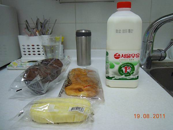 買了1罐鮮奶剛好喝5個早晨。這幾天的早餐都很簡單,泡熱可可或奶茶或咖啡,再加冰鮮奶,配麵包或水蜜桃或優格就解決了。
