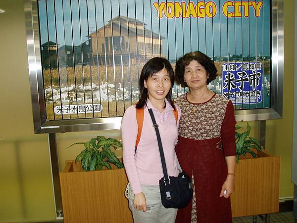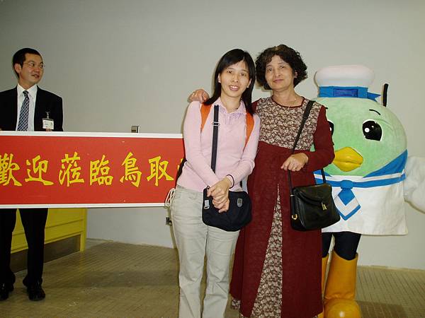 下午4點抵達米子機場, 這個航班是台灣與米子及富山地方特別申請的直飛專機,不過不懂為何要飛到這個機場呢?聽導遊兼領隊說,她還是第一次到米子機場!大概是太少有台灣客到這裡來,還有歡迎的紅布條哩!還送了一隻跟我們身後一樣的吉祥物迷你吊飾喔!