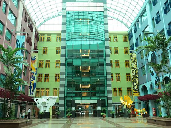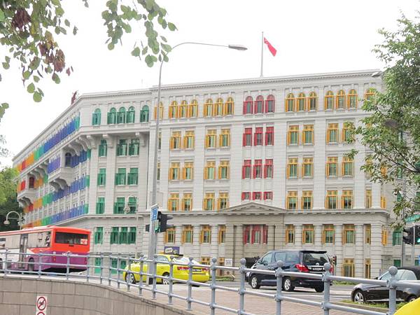 不過,旁邊就是新聞通訊及藝術部(Ministry of Information, Communications and the Arts)大廈,所以我們先過去參觀。這棟大樓以五顏六色的百葉窗吸引許多遊客目光,據說高達911扇窗哩!建於1934年,本來是警察局,2000年時,新聞通訊與藝術部才喬遷來此。