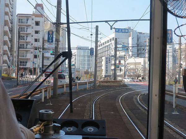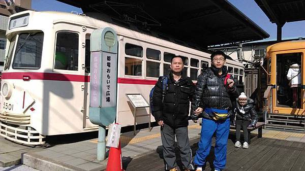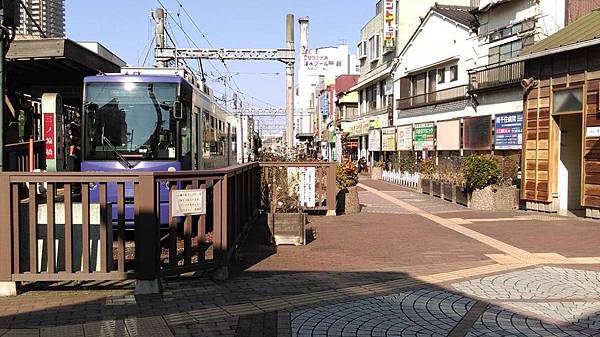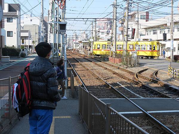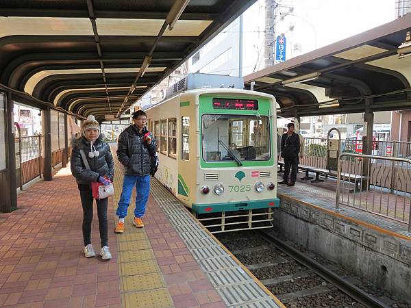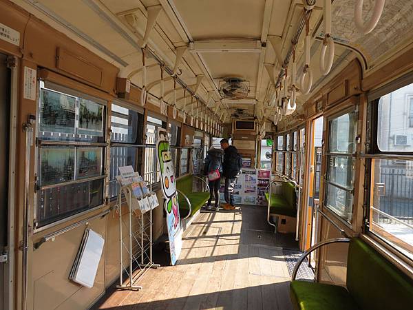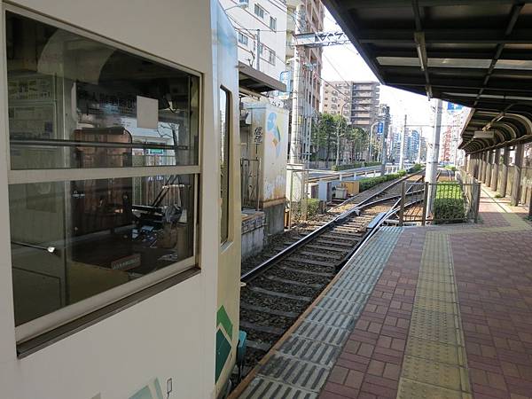 走進巷子內就看到毫不起眼的車站~這裡本來也是商店街,只是一大清早多半還沒營業。我們看到車子已經來了,沒多逛就匆忙上車了,可惜不知道班次很密集,不然應該多停留一下看看這個小站周圍的店家和民宅~