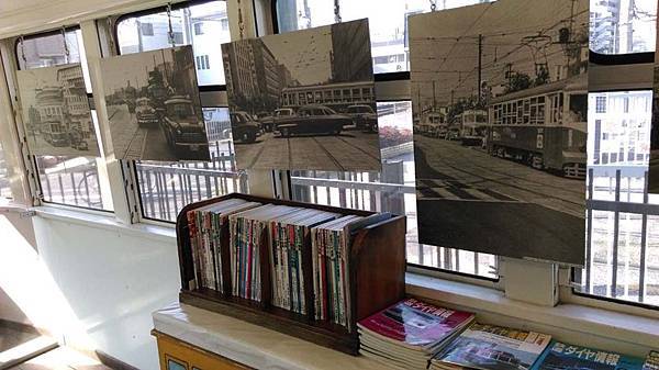 另一輛白色車廂內展示著這些電車的歷史昔日與一般車輛共存的繁盛景象。