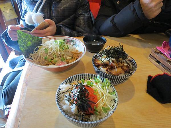 這家其實是油そば(油蕎麥)專賣店(當然是回來之後才知道),我們家還是愛吃飯,這二碗飯都不到300日圓,是在東京吃過最便宜的一份餐了,而且也很好吃!麵類比較貴一點,720日圓,分量也不多,我覺得以這個價格來說倒是還好而已。不過才花1380日圓就解決全家一餐,CP值也算超高的!而且免費的熱湯還不是喝到不想喝的味噌湯喔!也說不出是甚麼味道,還不錯喝就是了。
