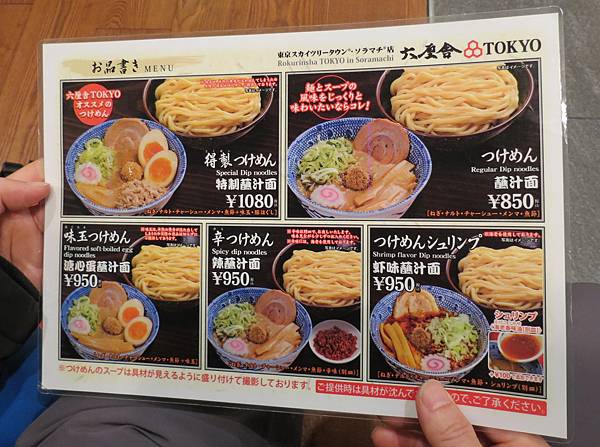 菜單雖然有五張照片,其實只有三款選擇分別是「沾麵」(850圓)、「半熟蛋沾麵」(950圓)、「特製沾麵」(1080圓),其他兩種是不同的辣味。