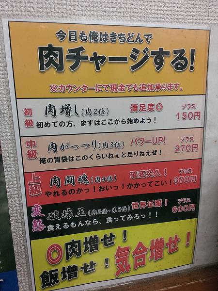 對愛吃肉的人,這家是很好的選擇,你可以另外加2-5倍的肉!其中一道「變態破壞王」,標榜的是比平常份量多五倍肉和多兩倍飯的丼飯,只要再加¥580。(吃得完真的很變態~)