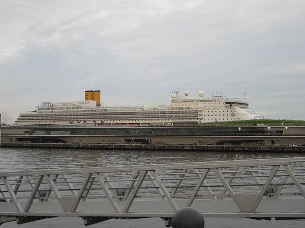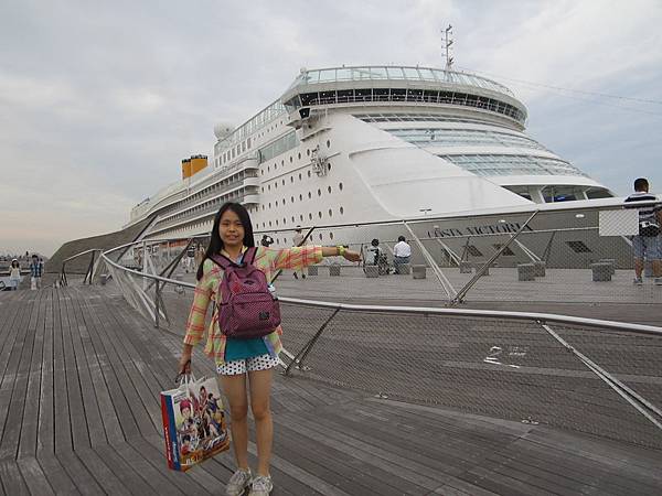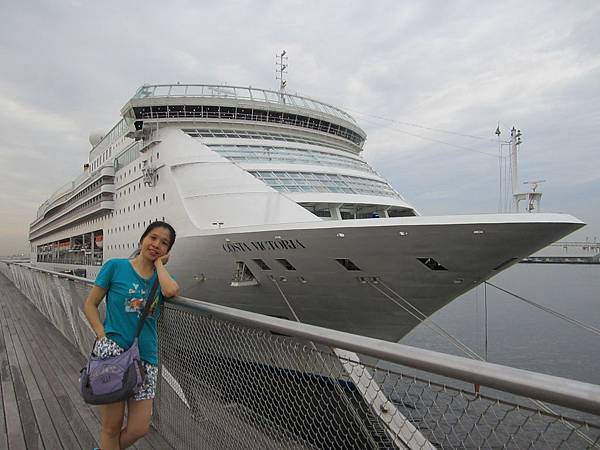 這艘是歌詩達郵輪「維多利亞號」(Costa Victoria),聽說一共有14層樓哩!房間多達近千間,總共可以載客2千多人喔!船身長度超過250公尺耶~