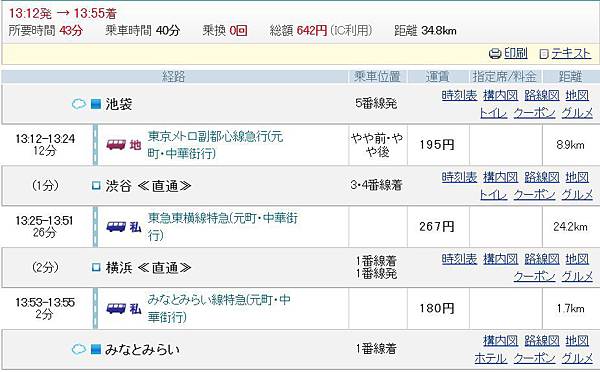 從池袋到橫濱みなとみらい(港未來)站包含三間地鐵公司的路線:東京Metro副都心線(池袋-涉谷)、東急東橫線(涉谷-橫濱)、港未來線(橫濱-みなとみらい),2013年3月16日以前還得在涉谷站從副都心線轉乘東急東橫線(先出站再進站),現在一班車就可直通,只要40分鐘就到了,真的非常方便,這也是後來我決定住池袋飯店的主要原因。