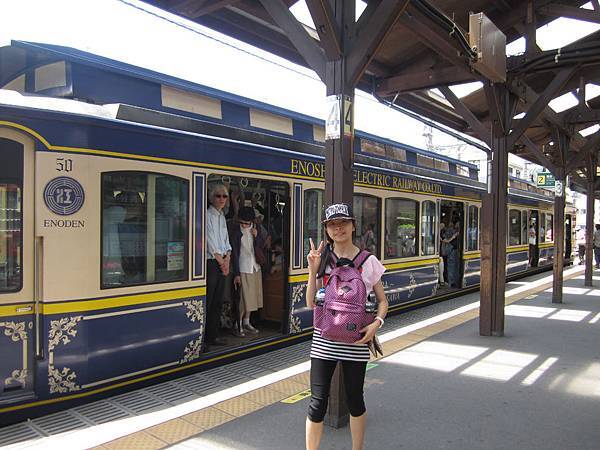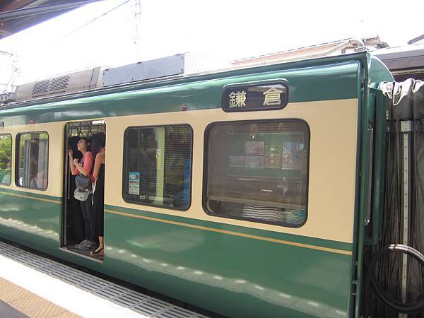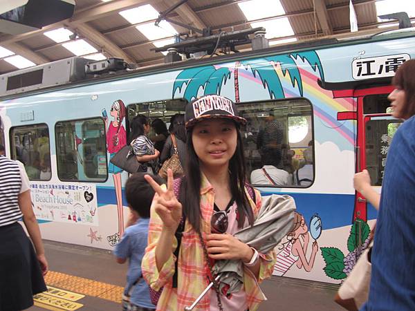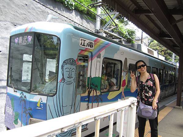 這班江之電列車有彩繪車身,著名的鎌倉大佛我們就來不及去參觀了~那就跟車身上的大佛合照吧。