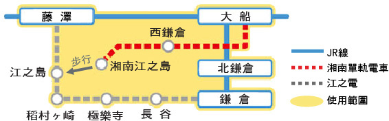 這天在JR藤澤站買了「JR鐮倉/江之島通票」一日券¥700,可以無限次乘坐鐮倉、江之島地區的JR線、江之電和湘南單軌,真的非常划算!雖然鎌倉地區的交通套票還有「江之島−鎌倉周遊券」、「江之電一日乘車券」,但只有JR套票有包含少見的懸吊式湘南單軌電車喔!