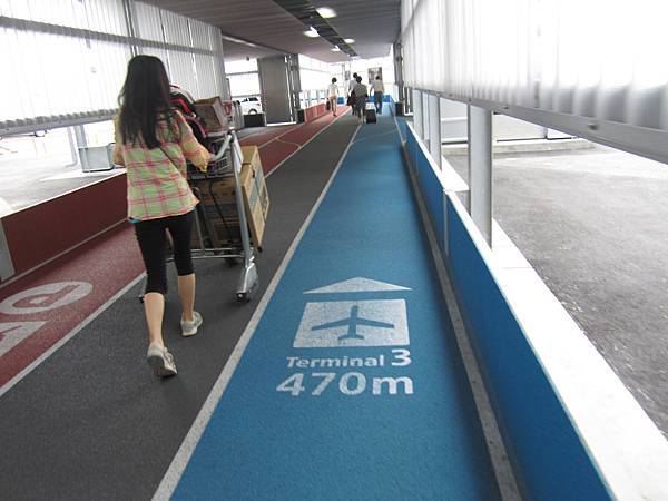 因機場二航到三航的接駁車會先繞到一航會比較久,加上這堆行李還要上上下下挺麻煩的,反而走路過去比較方便,不到700公尺。
