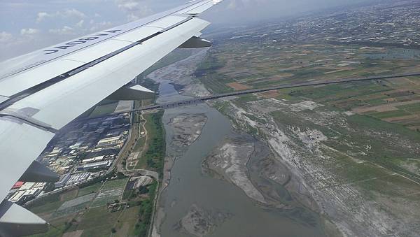 即將降落高雄小港機場前的空拍景象,我猜這是高屏溪吧?沙洲隱隱約約出現台灣島的形狀耶!