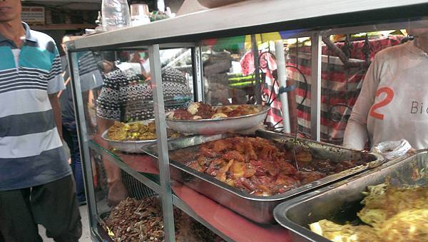 後來遇到一個當地人,主動問我們要去哪?我們跟他說要午餐,他便說要帶我們過去,老公擔心被騙本來不要跟他去,我說反正看看也好,太貴頂多不要吃就好了。於是他帶我們來這家位在中間一個不起眼的小攤位,我們看著柱子上的菜單(沒標價),問他要多少錢?他問了老闆,回答我們25K。雖然聽不懂印尼話,但看他和老闆說話時的表情,彷彿就是在說:「你看這樣可以算多少錢?」「收這麼多好嗎?」老闆感覺很老實,但掮客就一副要他多收一點的表情。