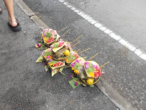峇里島的清晨,都會看到每一戶及各作生意的店家都用棕櫚葉編的簡易小扁籃,放入鮮花朵,再插一支素香,擺置在大門口及各處大小神龕前供奉,所以走路要小心別踩到了。