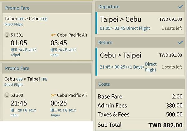 還有一種可遇不可求的大促銷,像前幾天宿霧太平洋航空推出的1元機票,臺北直飛菲律賓度假天堂宿霧來回機票含稅還不到900元,比搭統聯到墾丁還便宜,而且還是228連假(請1天假玩5天)耶!聽說有人搶到2017年農曆年來回含稅1千多元,只可惜我得知訊息慢了幾小時,只能扼腕呀!