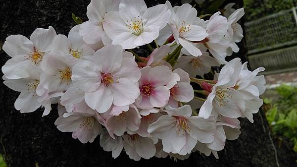 初期開花花瓣呈淡粉色,盛開時就轉為白色,偶爾從樹幹中間冒出的櫻花,讓我們可以近看這花朵的特徵。