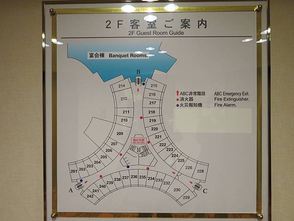 抵達飯店已經快10點了,拿到房號230的鑰匙,出了電梯看到這個逃生圖,我心裡就納悶房間怎麼大(最右下角)?難道是無障礙客房嗎?