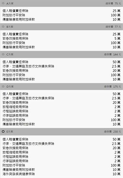 萬一來不及辦旅平卡,直接官網線上投保保障也是一樣,選擇最完整的E方案,才會有其他海外突發疾病等保障,保險不是只保來賠旅行不便險的,既然都投保了,不要省那幾十元吧!
