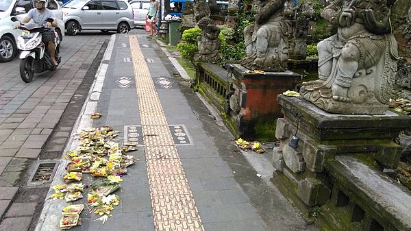 雖然祭拜是峇里島人民不可或缺的一部分,不過這些放在人行道祭拜的小花盒Canang,難免被熙來攘往的遊客給踐踏,還真是市容的一大亂象呀!