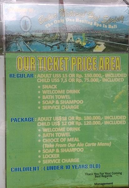 Batur Natural Hot Spring大人純泡湯150K,包含浴巾、盥洗用品和迎賓飲料。另外有搭配簡餐的方案180K,才加30K便多了一份餐點,比那個火山自助餐100K便宜太多了。