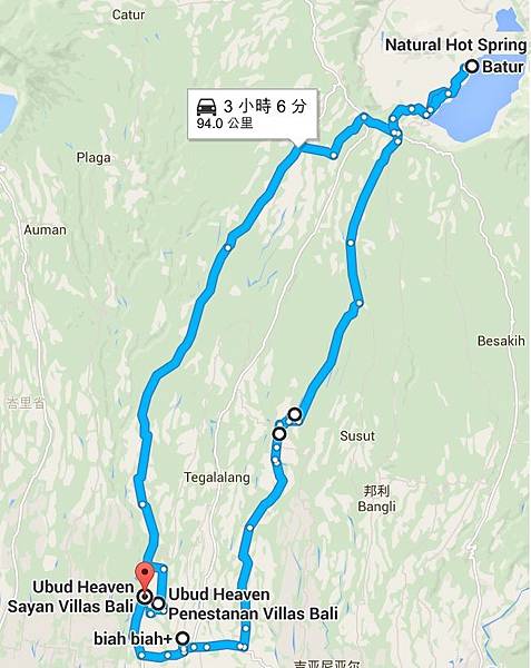 今天的行程是要往峇里島的中部山區,巴杜爾火山(Batur)和巴杜爾湖,地圖上來回近100公里的路看起來也不會太遠,但峇里島的路況並不是很好,所以一天下來竟然只去了兩三個點XDD