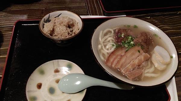 花笠そば應該是這裡的招牌,「そば」在日文是指蕎麥麵的意思,但沖繩そば(沖繩麵)卻是跟一般中華麵一樣用小麥粉做的,再加上一大塊的爌肉。這份套餐還有附上一小碗炊飯,我是覺得炊飯比沖繩麵好吃就是了。