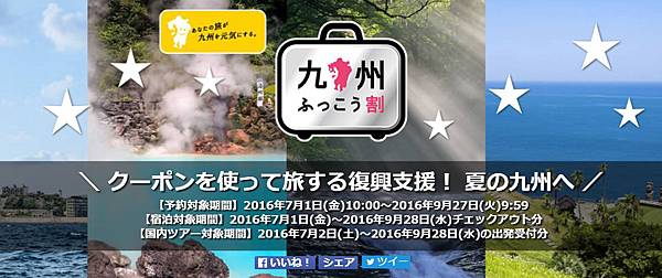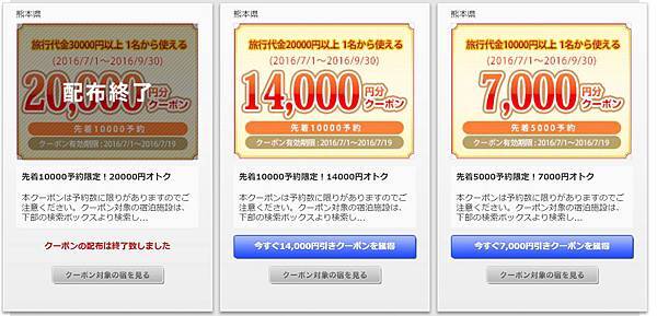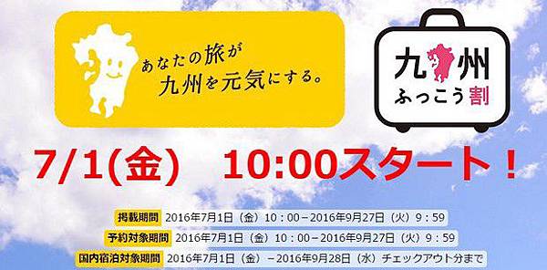 在6月底看到這個日本政府因熊本地震推出的振興九州的住宿方案,送了不少住宿券給日本及海外遊客,但因數量有限,還有限定入住期間,得先搶到住宿券才能訂房。而我原本是2016年9月初的行程,剛好適用,為此,7月1日當天我還專程請了假來搶券。