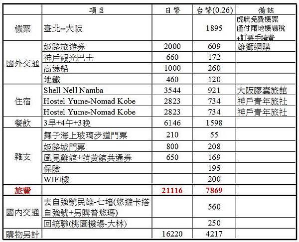 | 日期 | 項目 | 日幣 | 台幣 |