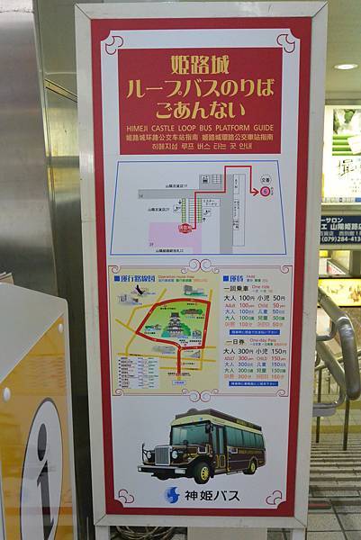 環遊姬路城的觀光巴士,每次只要100日圓,9:00-16:00每個整點和30分發車,我們本想搭一趟體驗一下,不過還得等20分鐘才有車,本來想說回程再搭,結果也忘了這事。不然花個¥100繞一圈也挺不錯的。