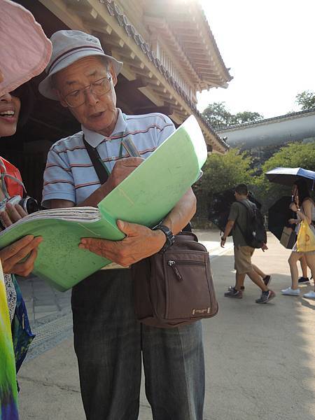 才剛進大門就遇到一位老爺爺「搭訕」,他是這裡的解說志工,用頗流利的中文問我們說,他正在學習用中文解說,可以讓他練習嗎?我們本來有點擔心花太多時間,但想說與其走馬看花,多認識一點這座國寶也是不錯,就接受他的「邀約」了。