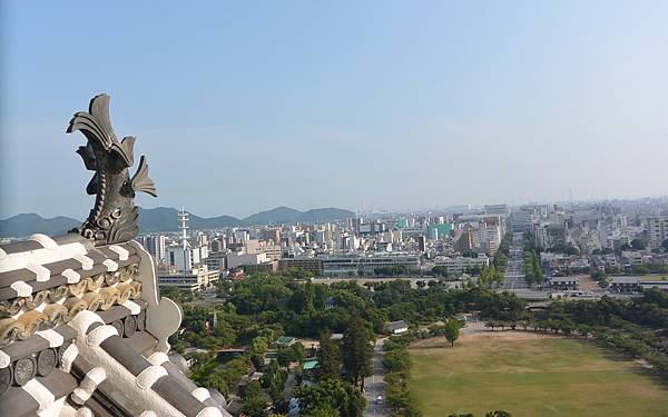 欣賞這居高臨下的美景,一旁的「魚虎」聳立在屋頂上,鎮守著天守閣。
