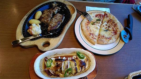 這家的特色餐點就是漢堡排,我們點的是基本款200g¥678,另外還點了披薩¥645和烤花枝¥494(含稅),以這樣的海景餐廳,這家的價格CP值簡直爆表!我覺得那隻烤花枝比漢堡排更好吃!披薩就普通了一點。