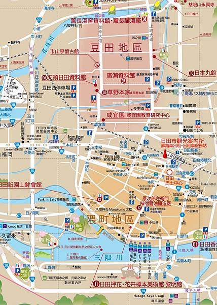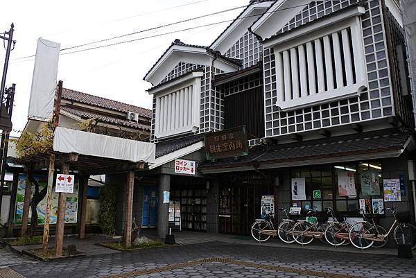 車站周邊步行可達的觀光區域有二個,其一是車站南邊的三隈川畔的隈町溫泉街,其二是要車站北邊的豆田町商店街,兩者完全不同方向,我們只停留2個小時,如果想兩邊都走一圈,得騎腳踏車才有可能。我本來是計畫要租借腳踏車兩區都騎一下,2小時花個¥300,台幣不到100還算便宜,只可惜當天微雨,只好作罷,改用步行走訪豆田町就好。