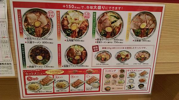 我事先有看過它的菜單,所有拉麵加150日圓升級大碗、加400日圓就可加購炒麵和煎餃各1份喔!
