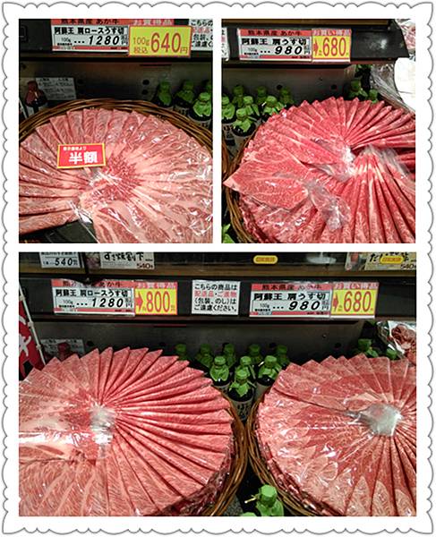 剛好我們中午吃煎餃有附一小小瓶醬油,所以下午去三角回來我們又回到鶴屋來買阿蘇和牛,搭新幹線再回飯店享用了。原本油花比較漂亮又比較貴的晚上變半額,可以用更便宜的價格買到更好的部位,真好!