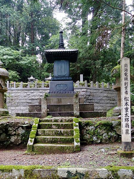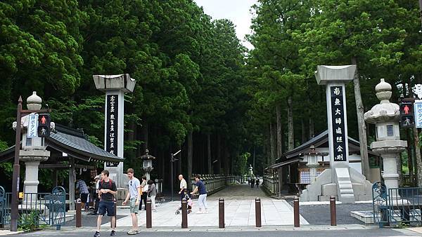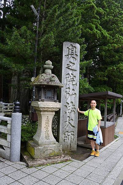 下車的「奥の院口」站,是【奥の院参道】的起點,参道前就有一個大大的石碑,紀念日本佛教真言宗的開山祖師-弘法大師。西元835元入定於高野山奥の院御廟,「奥の院参道」終點便是奥の院御廟,不過我真的事先沒認真做足功課,所以竟然在御廟前橋就折返了,殘念...