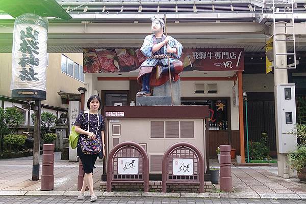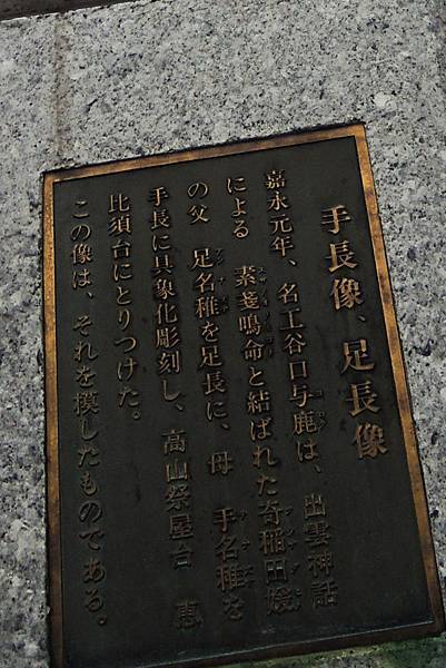 看雕像下面的紀載,這2個雕像是出雲神話故事裡的足名稚(アシナヅチ)和手名稚(テナヅチ)的具象化,同時也是高山祭屋台「惠比須台」的雕像。