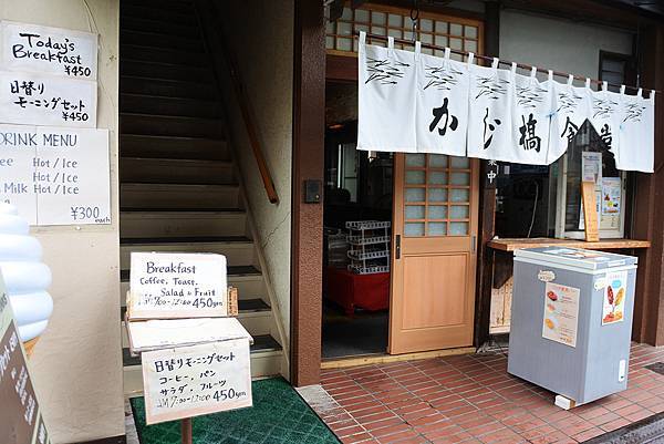 下面這家かじ橋咖啡就在宮川朝市裡面,西式早餐一份¥450,是今天早餐的口袋名單之一;但後來我們想去吃另一家YABUTEN(やぶてん)一份¥400的早餐,它不僅有西式早餐,還有日式早餐,感覺更超值,所以也就沒進去了。