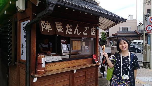 我們經過路口這家陣屋だんご店時,聞到陣陣的香味,看到有不少人排隊買,一串醬油味烤糰子只要¥80,我們也各買一串,吃起來就像烤麻糬一樣QQ軟軟的,果然也是高山必吃美食之一喔!