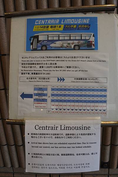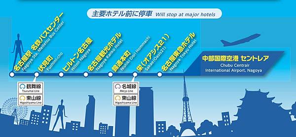 回程有兩個方案,第一個方案是走到榮站搭地鐵名城線到金山站再轉乘名鉄空港特急自由席¥1010,比較便宜班次也多但有點辛苦;第二個方案就是走到榮站的Oasis21巴士總站9號乘車處搭新特麗亞接駁車(利木津巴士)直接到機場¥1200,貴一點但不用轉乘。後來想說反正都要走到榮站了,到Oasis21還要走更遠一點,那還不如搭地鐵省一點錢、時間上也比較機動。