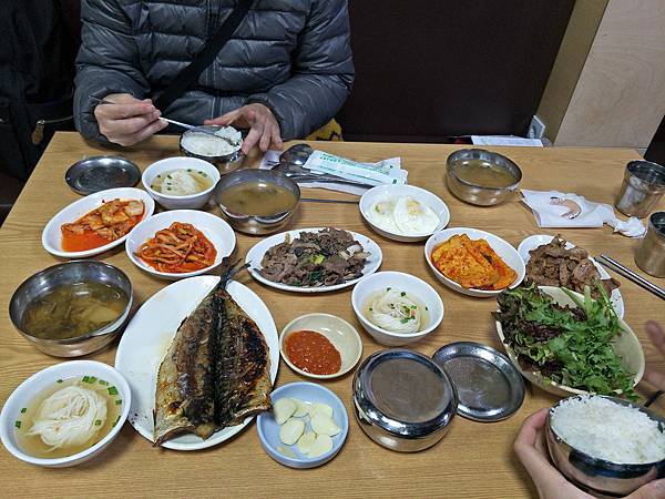 老娘還很飽,我們只點了3份餐,烤豬肉片超好吃、炒牛肉比較普通,鹽烤鯖魚是一整條,跟臺灣的百八漁場半條鯖魚180元比起來,就覺得這家的鯖魚很平價了。除了白飯還有一小碗麵線湯,一個人來吃的話我個人是會覺得太多,但對於男生來說,份量一定很夠!小菜據說可以再續,但我們是覺得也夠了,反正都是辣的...。