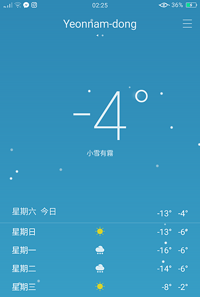 看了氣象預報,氣溫一路下滑,我們在首爾這幾天最高溫都在零度以下,週一要去滑雪那天最低溫還會來到零下16度,真的是腦殘了我,幹嘛把自己關在冷凍庫呀!