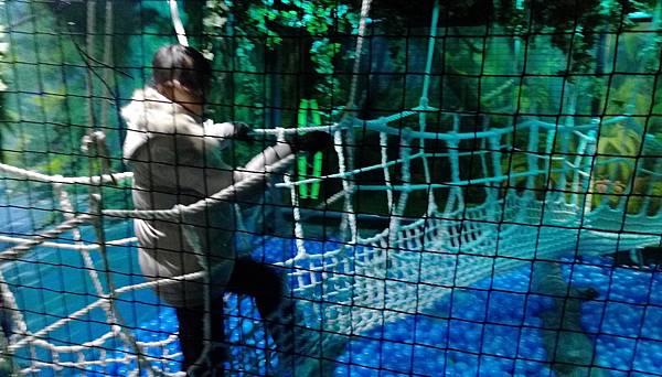 不過有些還有一點難度,需要同心協力才能過關,像中間有一個爬陡坡的,第一位就一定要靠手腳敏捷先衝上去把繩子丟下來讓後面肉腳無法徒手爬上去的同伴藉由拉繩索爬上陡坡,所以我們家就得靠兒子來先使勁當衝鋒囉!全家一起來玩真的還滿有趣的耶!