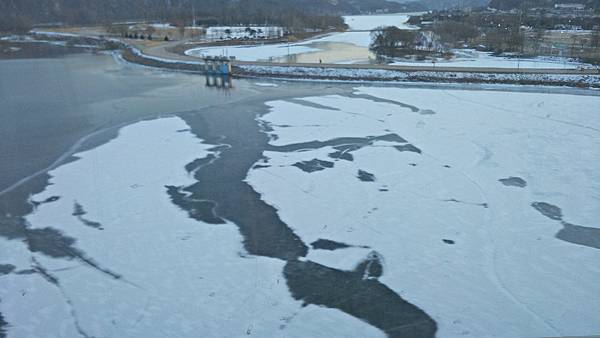 欣賞窗外的美景也是旅遊的樂趣,驚見結冰的河川~範圍還不小耶!