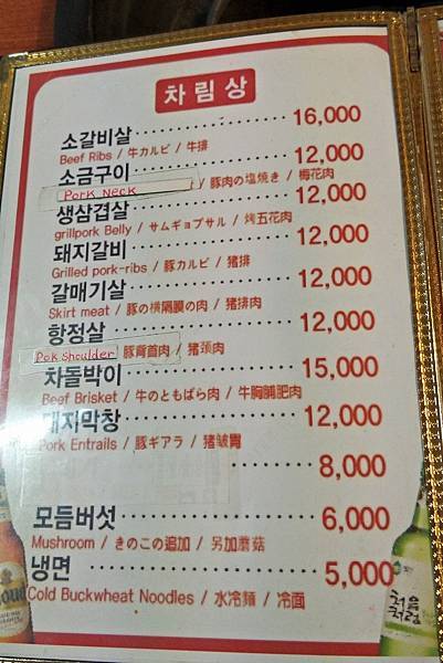 這裡的招牌就是第二個鹽烤豬肉(소금구이)。每個人都要點一份肉,所以我們點了1份牛排16000₩、2份梅花肉和1份五花肉,都是12000₩。